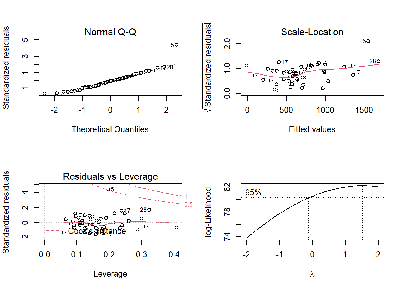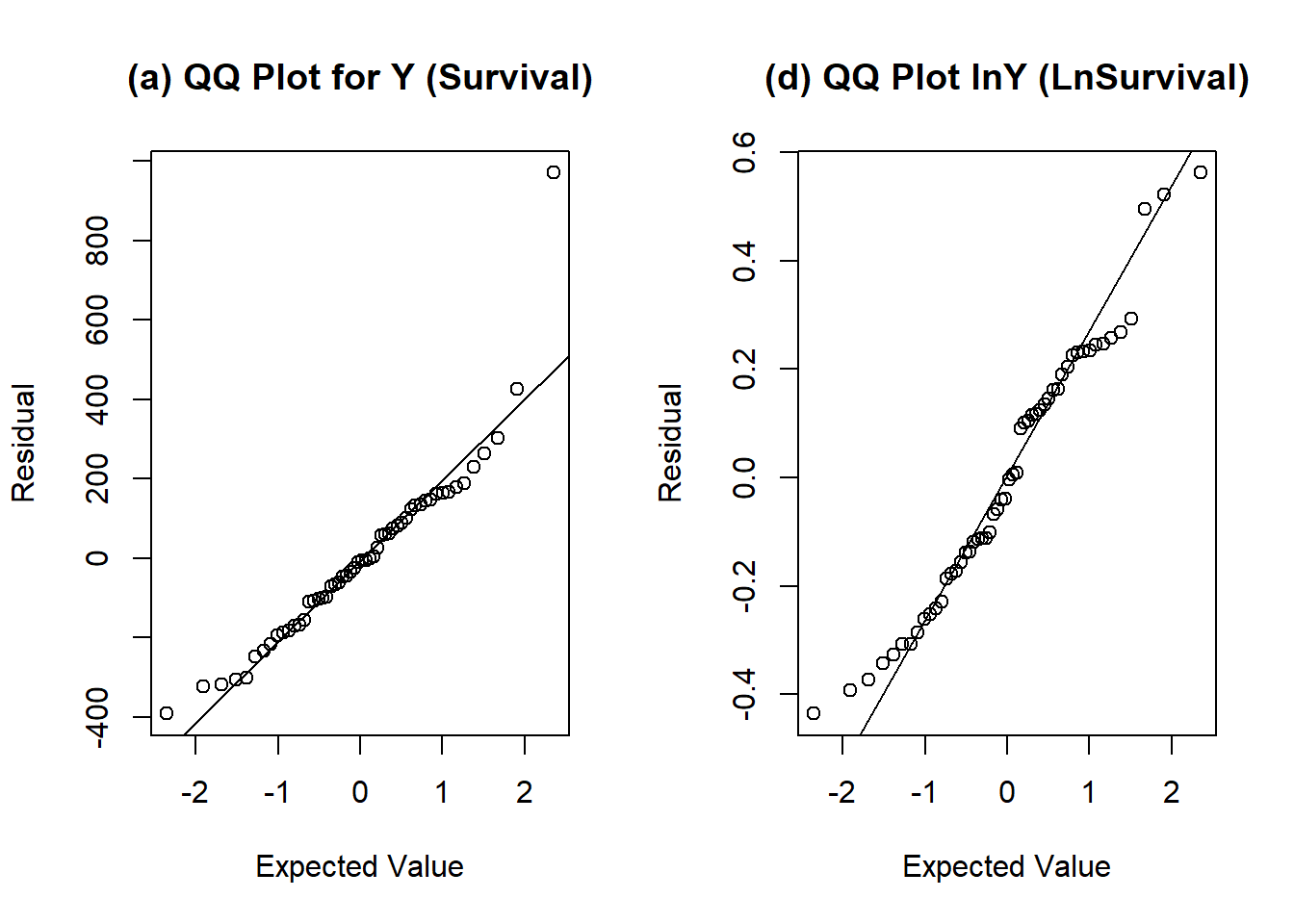 newsummary(lm(Lnsurvival ~ Bloodclot + Alcheav + Progindex + Enzyme, surg_lnSurv))