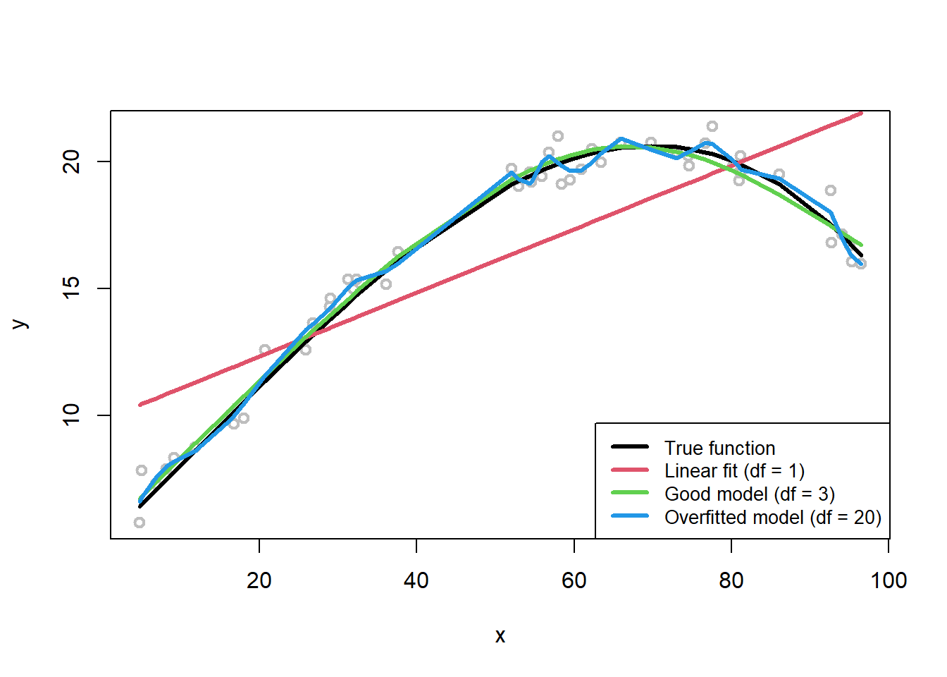 "Overfitted model (df = 20)"), lwd = rep(3, 4), col = c(1,2,3,4), cex = 0.85)