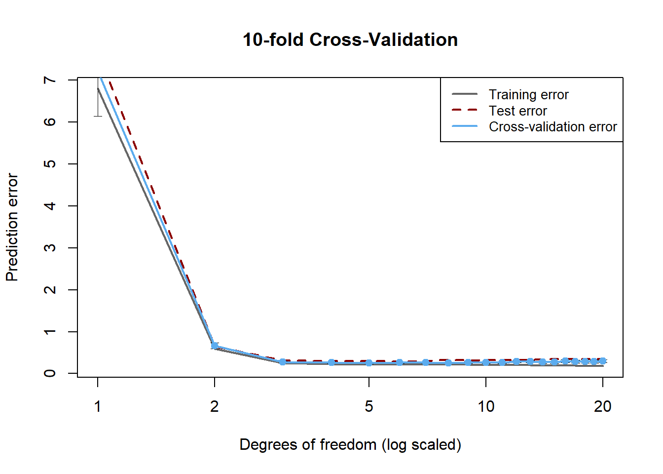 legend(x = "topright", legend = c("Training error", "Test error", "Cross-validation error"),